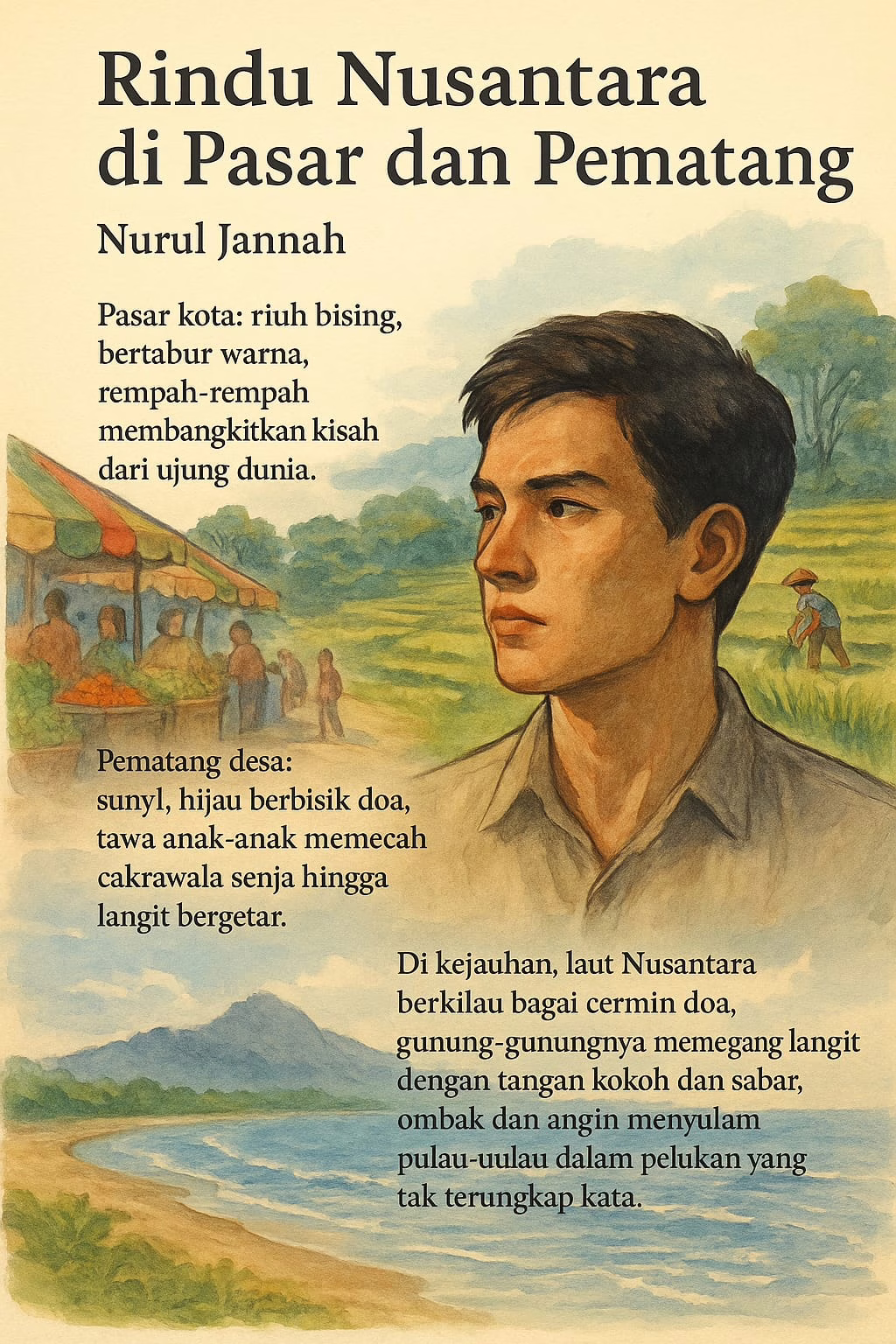 Nurul Jannah adalah penulis dan dosen yang menyalakan cinta tanah air lewat kata-kata. Dalam “Rindu Nusantara di Pasar dan Pematang”, ia merangkai riuh kota dan sunyi desa menjadi denyut rindu Indonesia: seruan lembut agar kita menjaga negeri dengan sepenuh jiwa.*)