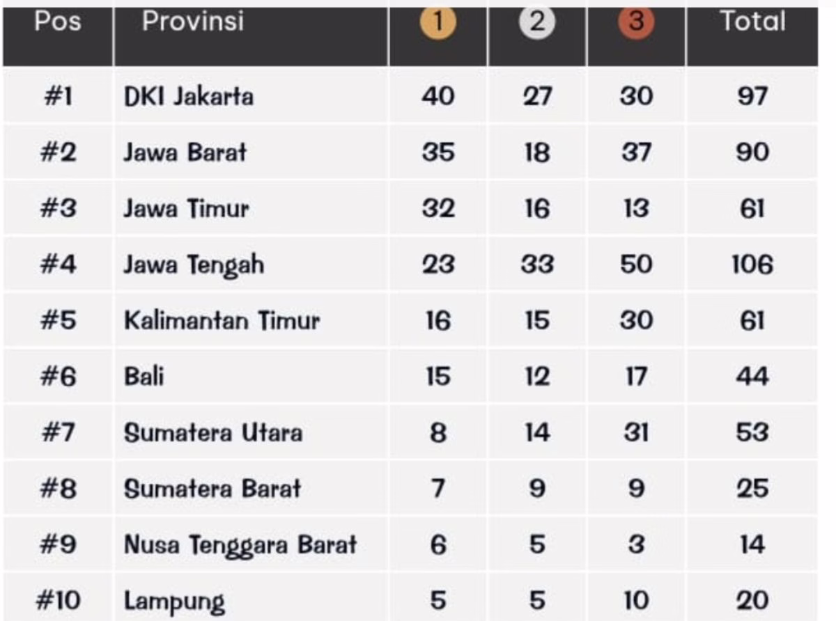 Di klasemen tiga besar, DKI Jakarta tampil sebagai juara umum dengan 40 emas, 27 perak, dan 30 perunggu (total 97 medali). Posisi kedua ditempati Jawa Barat dengan 35 emas, 18 perak, dan 37 perunggu, disusul Jawa Timur di peringkat ketiga dengan 32 emas, 16 perak, dan 13 perunggu.