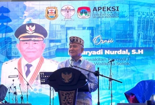 Wakil Walikota Solok H. Suryadi Nurdal menghadiri dan memberikan sambutan mewakili Komwil 1 APEKSI Sumatera, Wali Kota Medan Rico Waas yang berhalangan hadir dalam kegiatan APEKSI Outlook 2025 di Kota Bandar Lampung. (foto; ist)