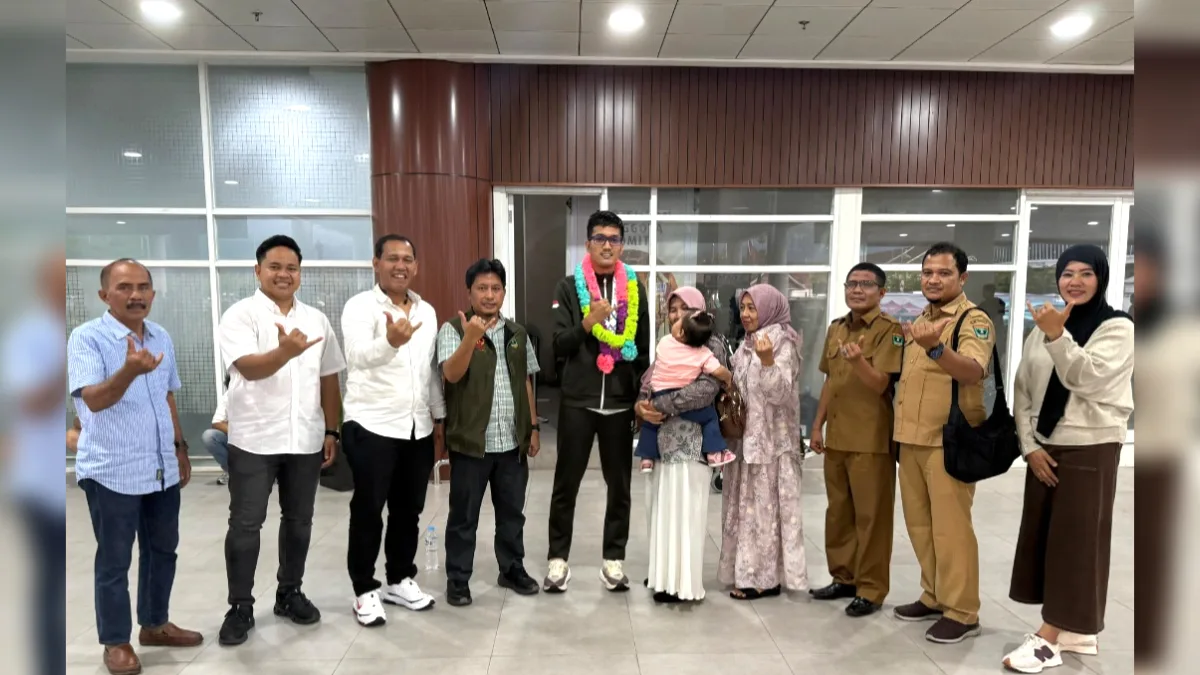 PADANG, FOKUSSUMBAR.COM- Atlet sepak takraw Indonesia asal Sumatera Barat, Samsul Akmal, yang turut menyumbangkan dua medali perunggu nomor beregu putra pada ajang SEA Games 2025 Thailand, tiba di Bandara Internasional Minangkabau (BIM), Padang Pariaman, Senin (22/12/2025).