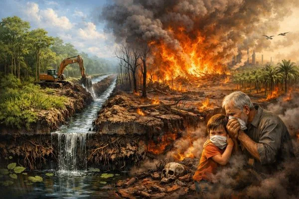 Seolah tidak ada keputusan manusia di baliknya. Padahal api gambut tidak pernah lahir tanpa sebab. Ia diundang oleh kanal. Ia disiapkan oleh pengeringan. Ia dipelihara oleh pembiaran.