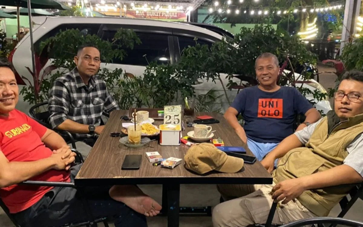 Ketua Harian Yulviadi Adek dan tim diskusi dengan anggota Dewan Pembina Ikasmantri Padang Evino Sugiharta (dua dari kiri), di salah satu kafe di Padang. (Foto istimewa)