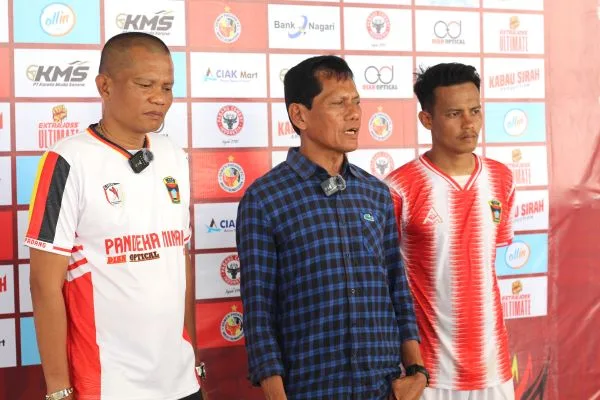 Coach PSP Padang, Joni Efendi didampingi kapten tim PSP, Agung Wijaksono dan Manajer tim, Indra Yunaidi Oyon memberikan keterangan kepada pers seusai pertandingan. (foto; vinas)