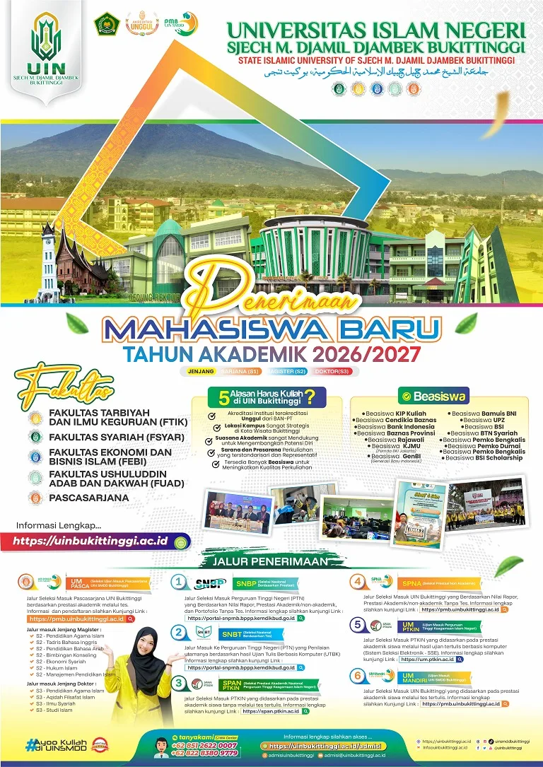 Informasi lengkap mengenai jadwal, persyaratan, dan mekanisme pendaftaran PMB dapat diakses melalui laman resmi Admisi UIN Bukittinggi di https://uinbukittinggi.ac.id/admisi/.