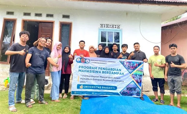 Mahasiswa, dosen dan masyarakat berswafoto dalam Program Pengabdian Mahasiswa Berdampak UNES tahun 2026. (foto; ist)