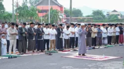 BATUSANGKAR, FOKUSSUMBAR.COM – Meski hujan mengguyur Kota Batusangkar, ribuan jamaah dari berbagai kalangan, mulai dari anak-anak hingga orang dewasa, tetap memadati Lapangan Cindua Mato untuk melaksanakan Shalat Idulfitri 1447 Hijriah, Sabtu (21/3/2026).