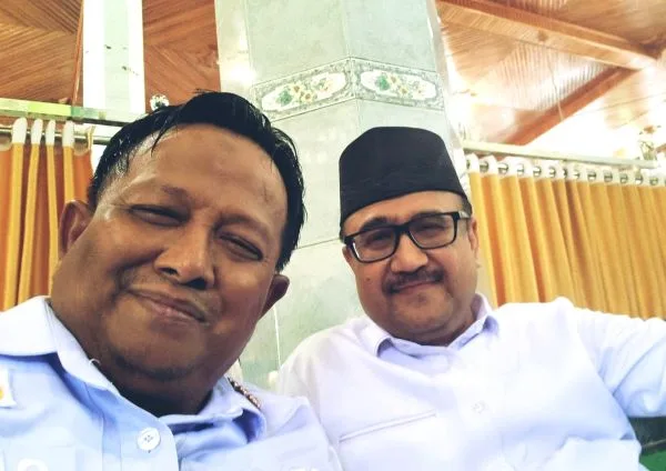 Ketua Ikasmanli Padang, Amrizal Rengganis berswafoto dalam sebuah momen dengan Jefferdian, alumni SMAN 5 Padang angkatan 91. (foto; ist)