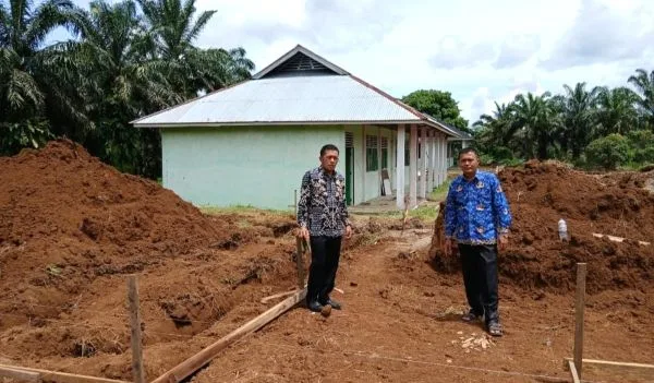Kepala Kantor Kementerian Agama Pasaman Barat, Rali Tasman, didampingi Kepala MAN 4 Pasaman Barat, Khairil Nasrul, tinjau pembangunan gadung madrasah setempat. (foto; ist)