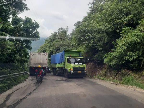 Truk dengan muatan melebihi kapasitas jalan provinsi itu juga sudah telah lama merusak jalan di tanjakan Sungai Pisang.