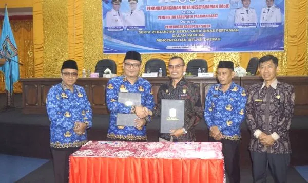 PASAMAN BARAT, FOKUSSUMBAR.COM – Pemerintah Kabupaten Pasaman Barat (Pasbar) bersama Pemerintah Kabupaten Solok menandatangani nota kesepahaman (MoU) dan perjanjian kerja sama (PKS) bidang pertanian dalam rangka pengendalian inflasi daerah, Jumat (17/4/2026), di Aula Kantor Bupati Pasaman Barat.
