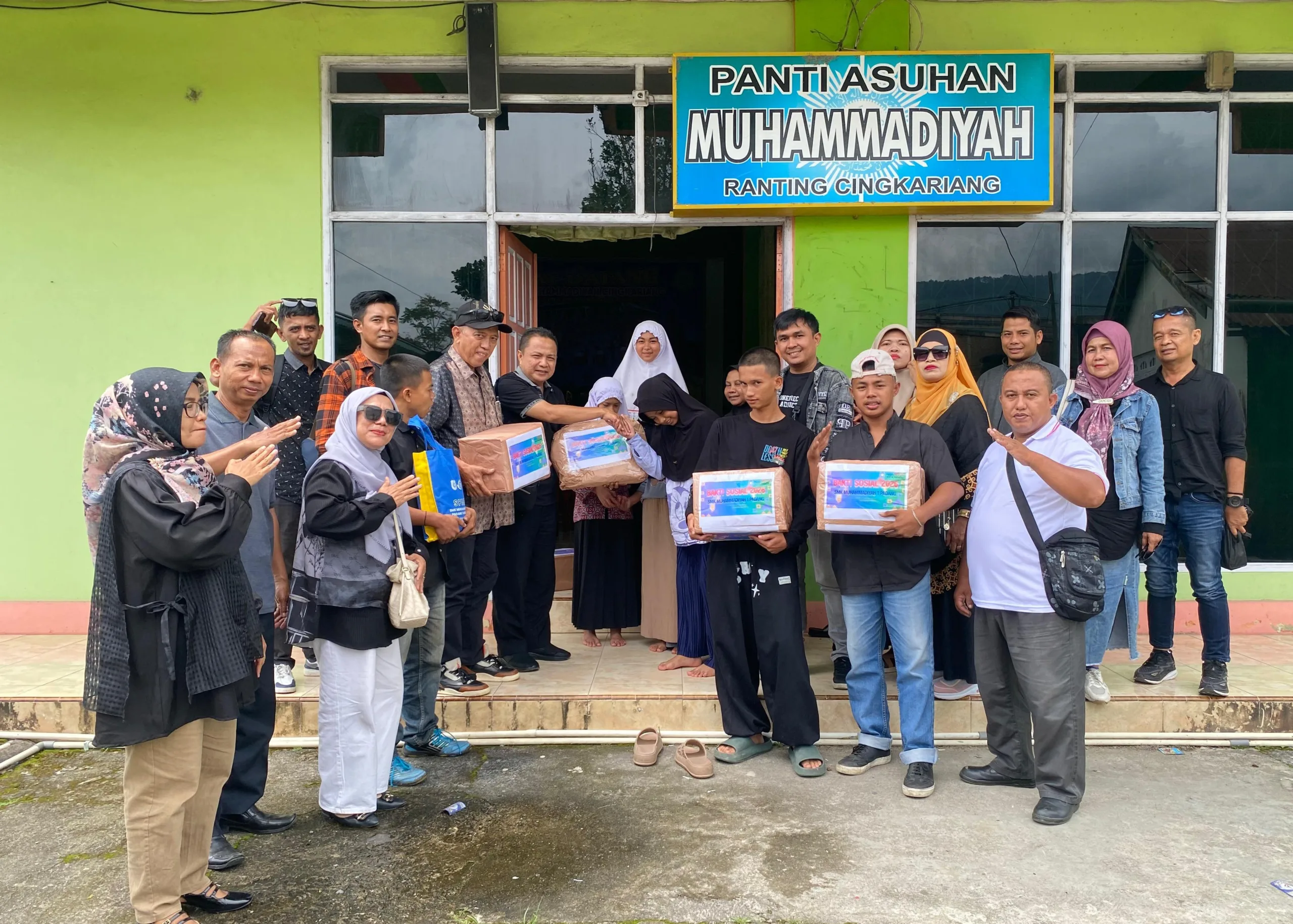Kepala SMK Muhammadiyah 1 Padang, Dr (Cand) M. Fikar Dt Rajo Magek, S.Ag., MM., M.Pd didampingi guru dan siswa serahkan bantuan untuk panti asuhan Muhammadiyah Banuhampu Cingkariang. (Foto; ist)