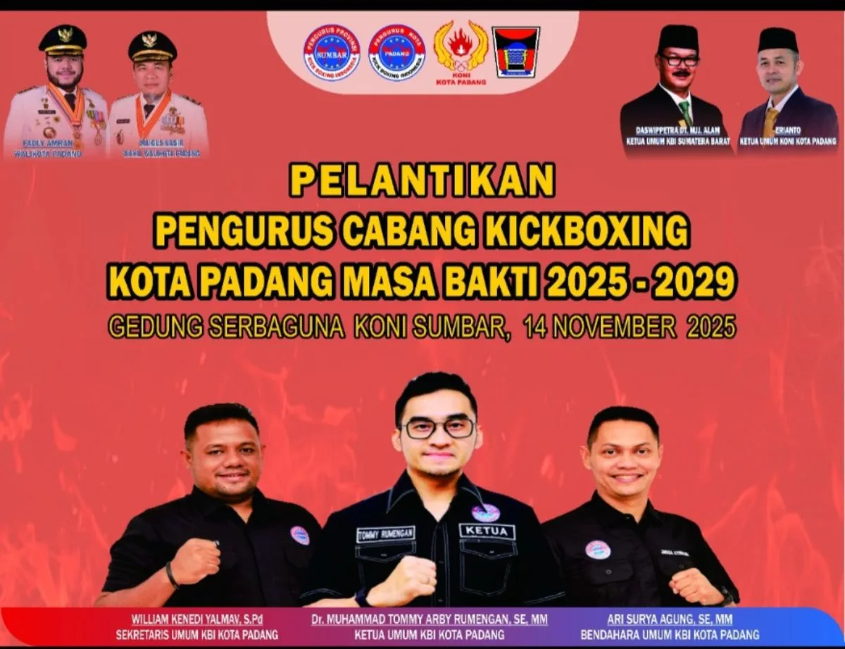 PADANG, FOKUSSUMBAR.COM— Pengurus Cabang Kick Boxing Indonesia (KBI) Kota Padang masa bakti 2025–2029 akan dilantik pada Jumat, 14 November 2025, di Gedung Serbaguna KONI Sumatera Barat, GOR Haji Agus Salim, Padang.