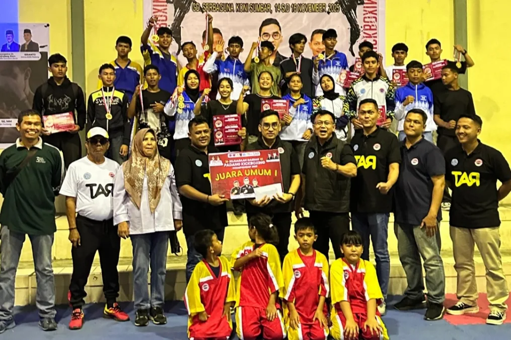 PADANG, FOKUSSUMBAR.COM — Kontingen Kota Padang memastikan diri sebagai juara umum Kejuaraan Daerah (Kejurda) Padang Kickboxing Championship se-Sumatera Barat 2025 yang berlangsung 14–16 November di Gedung Beladiri GOR Haji Agus Salim Padang.